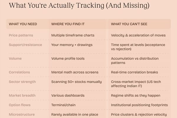 Institutional trading desks employ entire teams. One person watches correlations. Another tracks order flows. Someone else manages risk. Individual traders attempt everything alone with tools that haven’t fundamentally changed since the 1990s. Half the market operates invisibly. Velocity shifts predict momentum changes before they happen. Acceleration patterns signal reversals. Microstructure dynamics reveal whether selling represents accumulation or genuine distribution. These aren’t improvements to existing charts. They’re entirely different dimensions of market reality that require purpose-built systems to reveal. Take Thursday morning analyzing banking stocks. The traditional approach: check five tickers individually, compare RSI values, scan volume patterns, examine formations across timeframes, scramble through option chains. Thirty minutes later, you’ve missed the correlation break about to drive the entire sector. Now imagine a single conversation revealing HDFC’s velocity accelerating while ICICI’s momentum decelerates. Spotting accumulation patterns invisible on standard charts. Connecting overnight US banking weakness to specific impacts on Indian private banks versus PSUs. Not better analysis of what you see–revelation of what was always there.